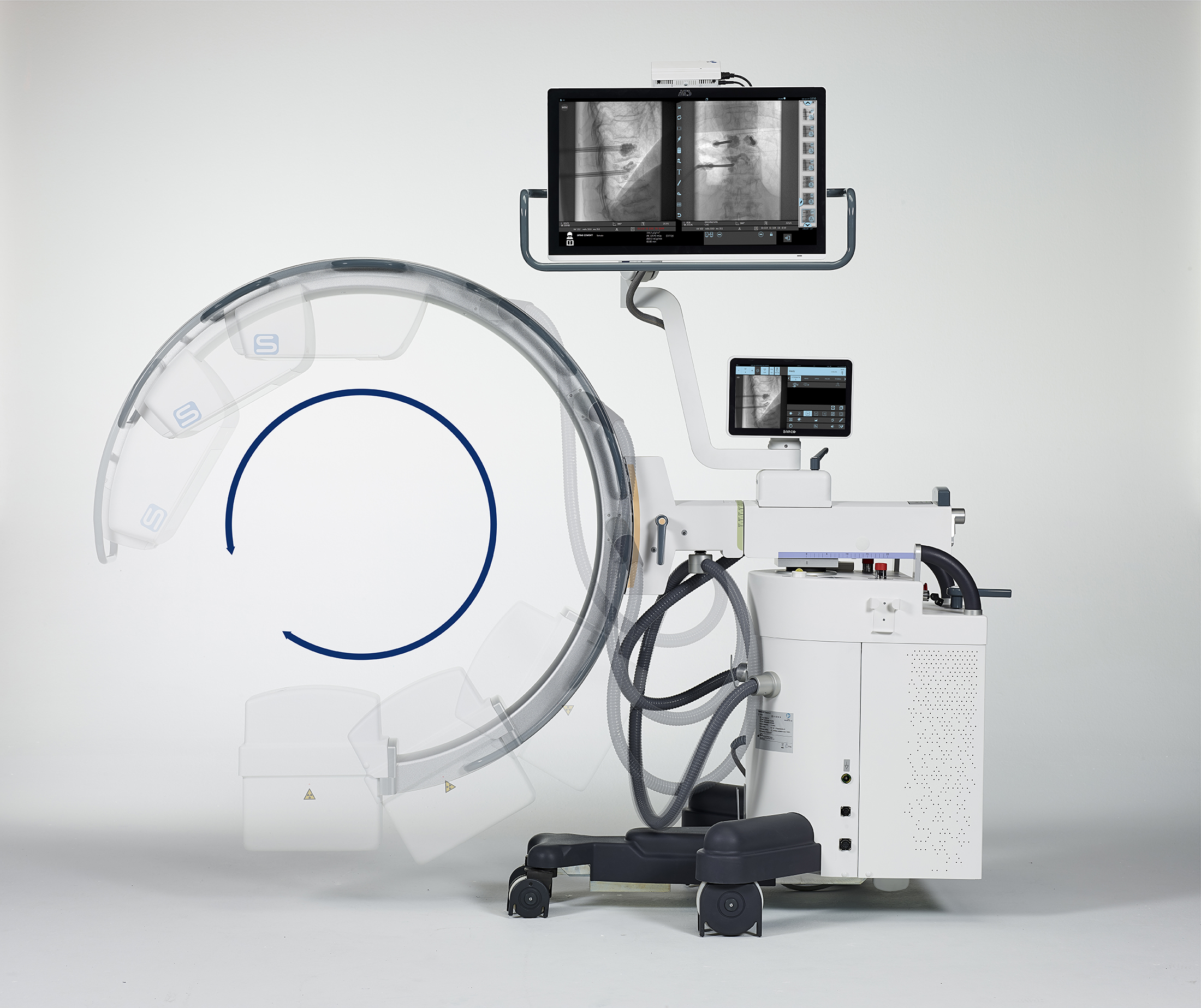Pełny, 360-stopniowy dostęp do obrazu zapewnia duży, 27-calowy monitor płaski o wysokiej rozdzielczości 4K, zamontowany bezpośrednio na ramieniu C. Takie rozwiązanie gwarantuje doskonałą widoczność obrazu niezależnie od pozycji operatora i ułatwia pracę zespołu zabiegowego.